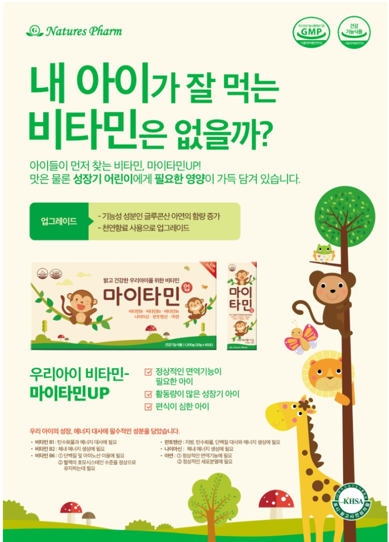 네이처스팜 건강한 삶을 위한 제품 개발사 정상적인 면역기능을 키우고 싶은 아이의 성장발육이 늦어 필요한 아이, 평소 편식을 자주 하는 아이, 튼튼한 치아와 뼈를 강화하려는 아이의 성장기에 영양섭취가 부족한 어린이 활동량이 많고 에너지를 빨리 소진하는 아이, 잠을 안 자려는 아이 상단의 이유로 해당 유아부터 소아까지 모두 필요한 영양소가 골고루 있어 면역력을 키울 수 있는 #아이비타민이라고 할 수 있습니다.