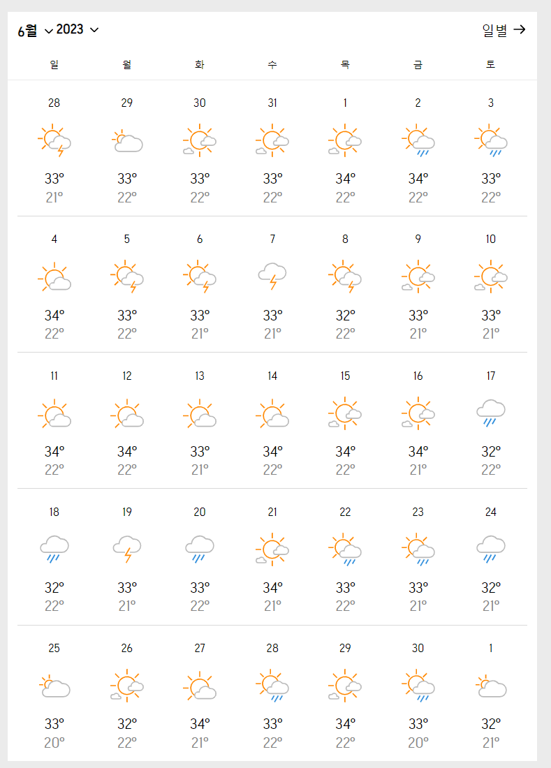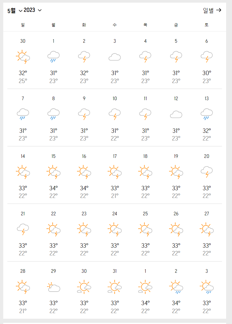 5월에도 비오는 날이 많습니다.3주차에는 여전히 비가 그치고 해를 볼 수 있겠으나 비가 내리지 않는 날씨에 최고기온은 34도에 육박합니다.할 것 같다