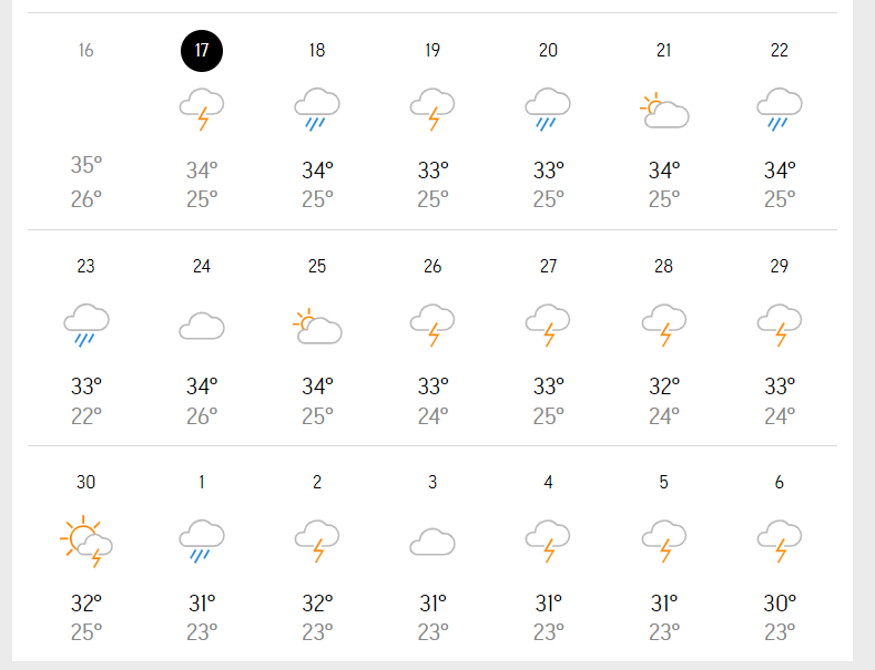 6월 상순부터 중순까지는 비가 오는 날이 드물다. 6월부터 건기들어가기 때문에 하지만 동남아시아 날씨로 인해 여전히 더운 기온이 예상됩니다.제발.