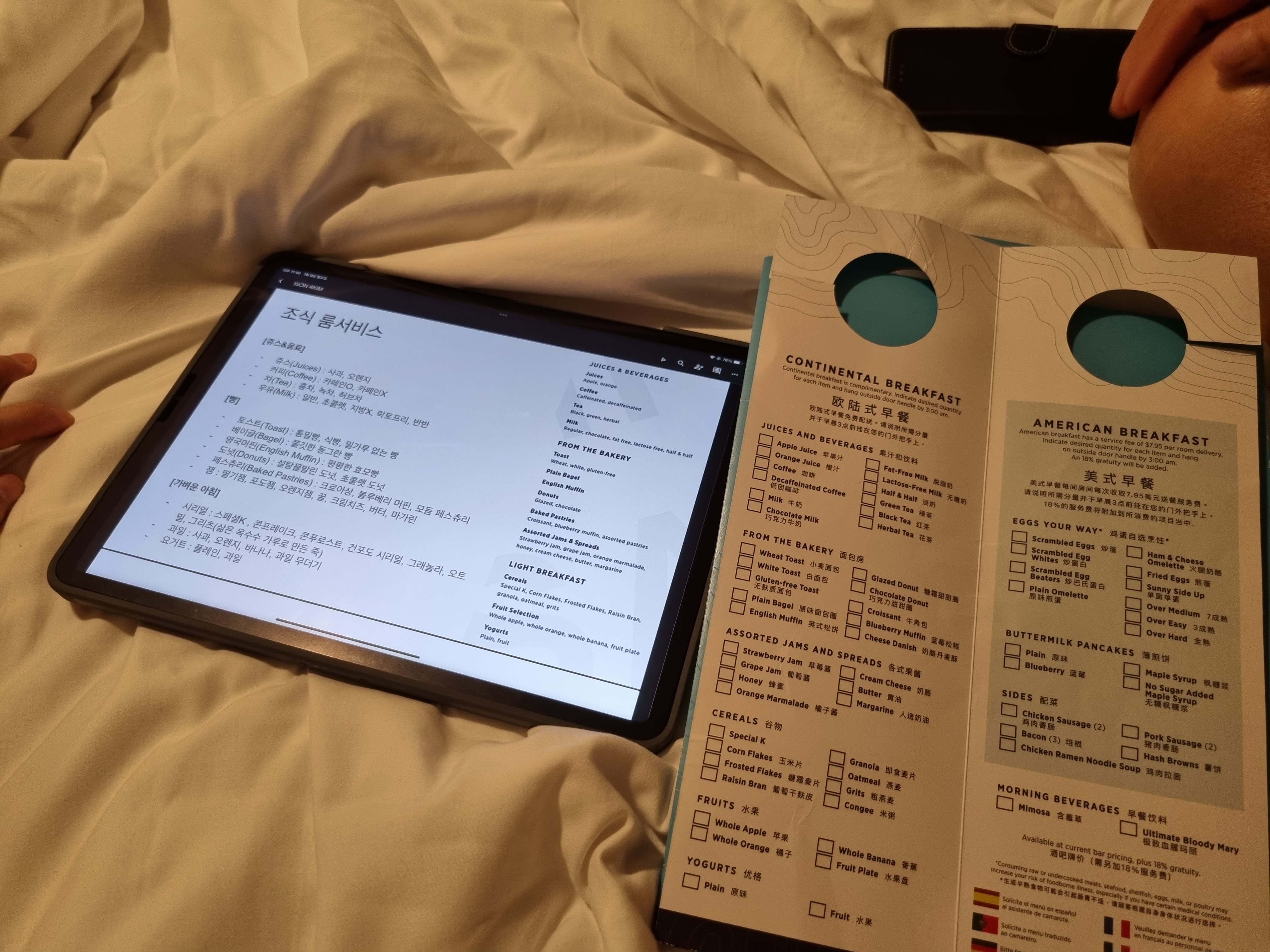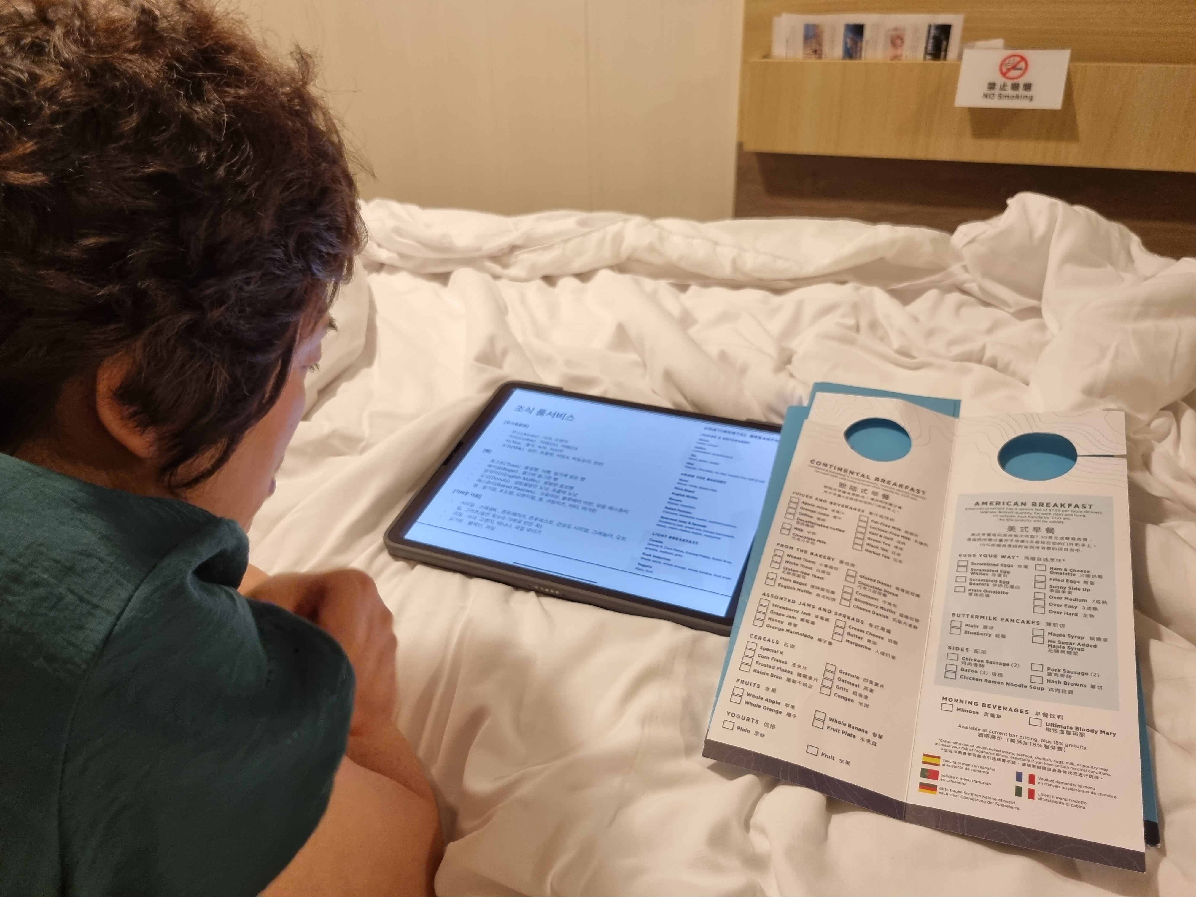 아침 식사 요청 양식과 룸 서비스 번역은 노인들이 스스로 선택할 수 있도록 iPad에 배치되었습니다.