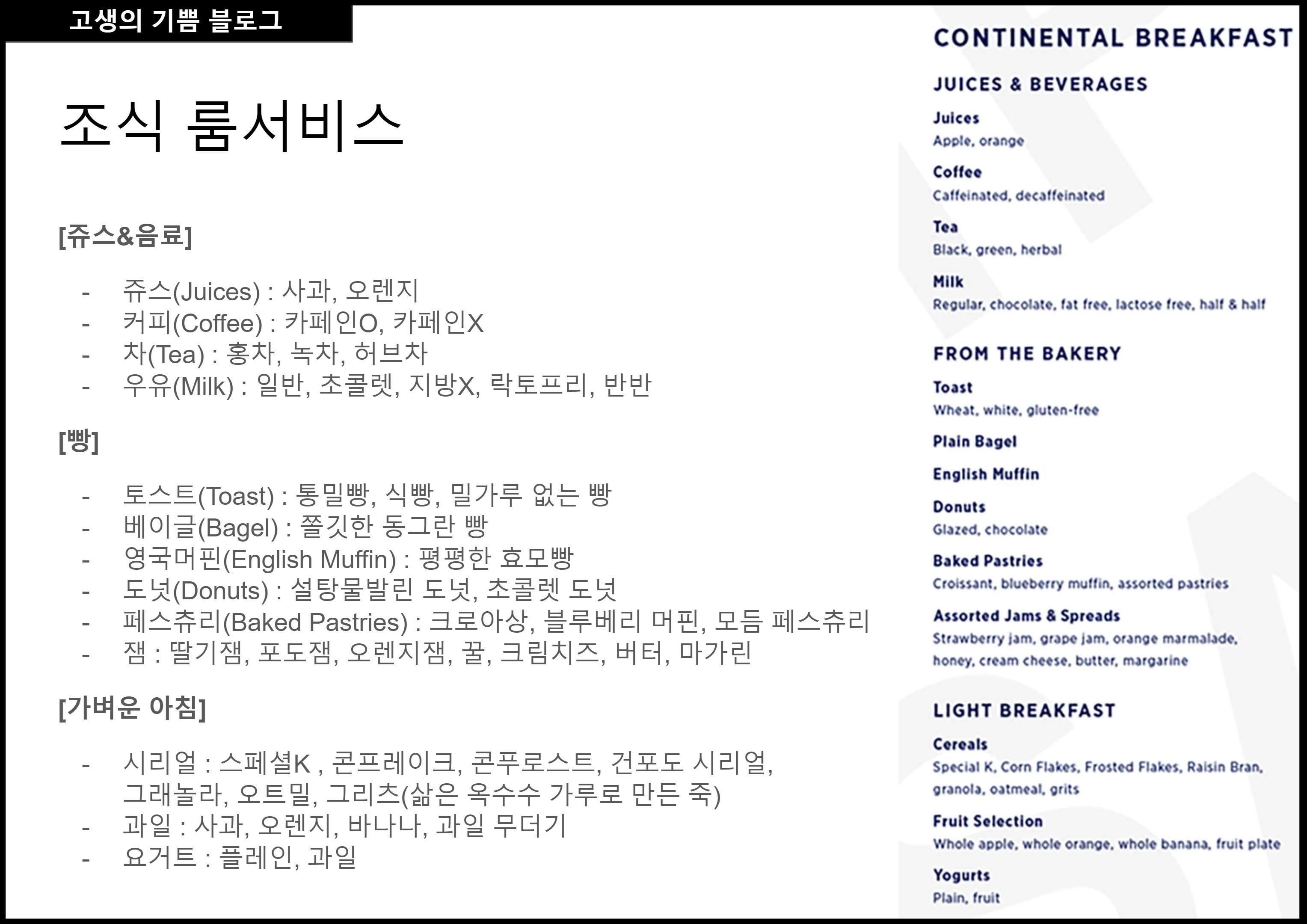 굳이 유료 조식을 방에서 먹을 이유가 없어서 그냥 무료 조식을 번역했습니다.